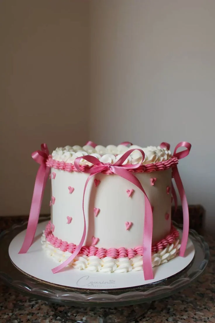 White single tier cake with pink piped borders, pink icing hearts on the sides, and four pink satin ribbons tied in bows.