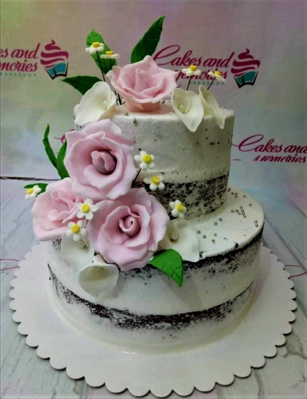 Two-tier semi-naked chocolate cake decorated with large pink gumpaste roses, white calla lilies, and silver dragees.