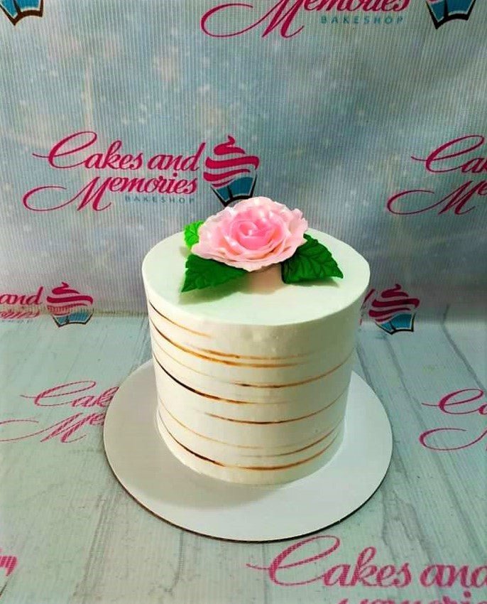White minimalist cake with horizontal gold stripes and a large pink gumpaste rose on top with green leaves.