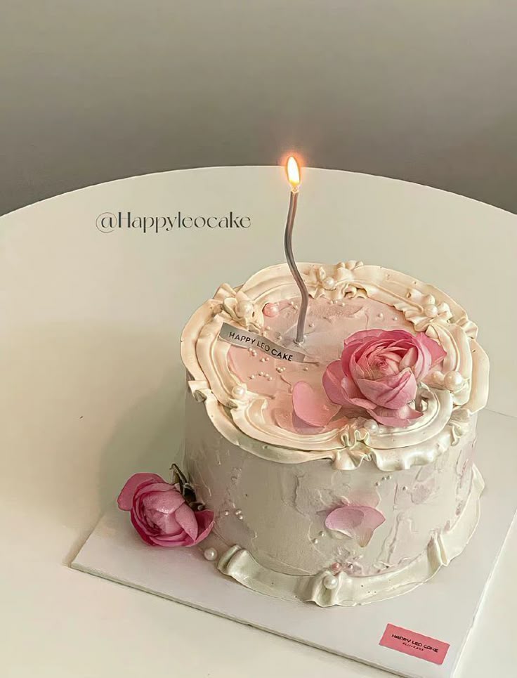Elegant white minimalist cake with pink icing roses, white pearls, and a tall silver candle.