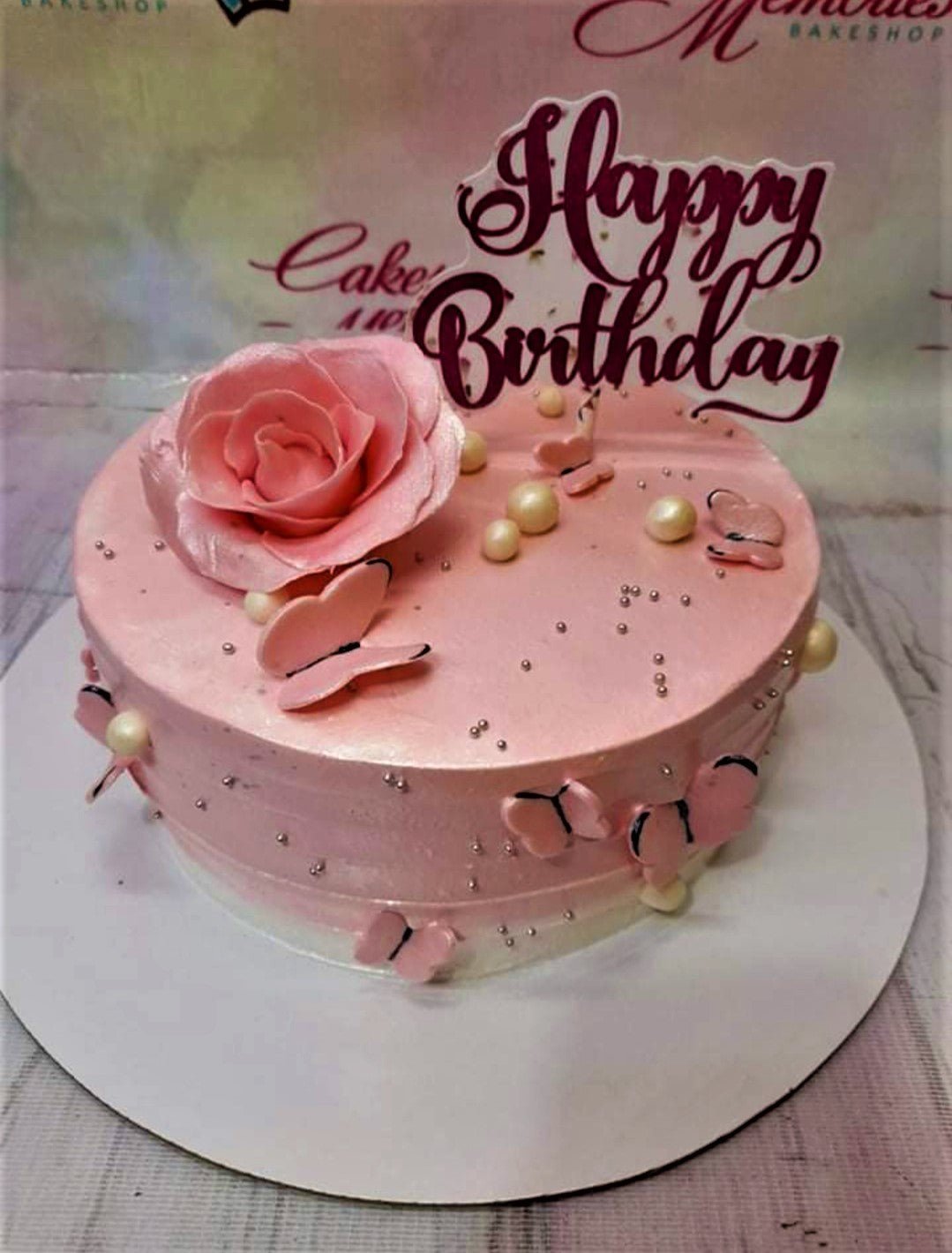 Pink birthday cake with a large pink edible rose, pink butterflies, and silver dragees.