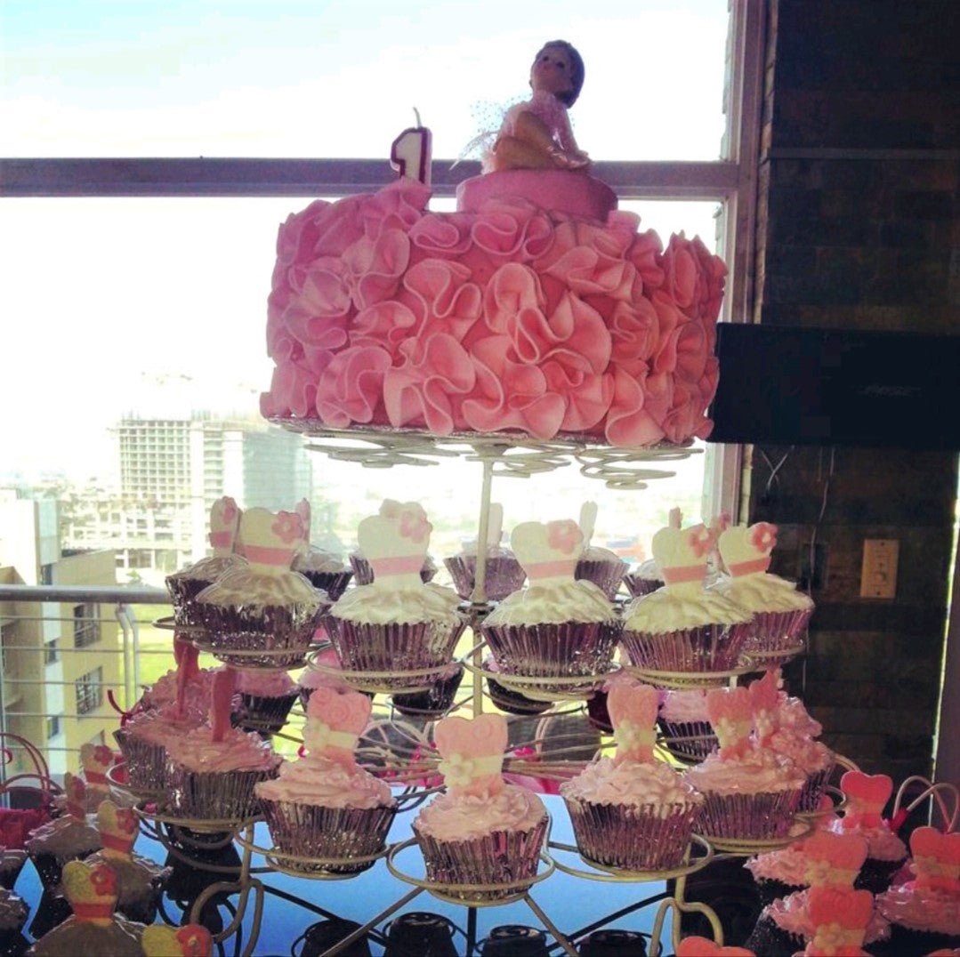 Pink ruffle icing cake with a baby figurine topper and matching dress-themed cupcakes on a white stand.