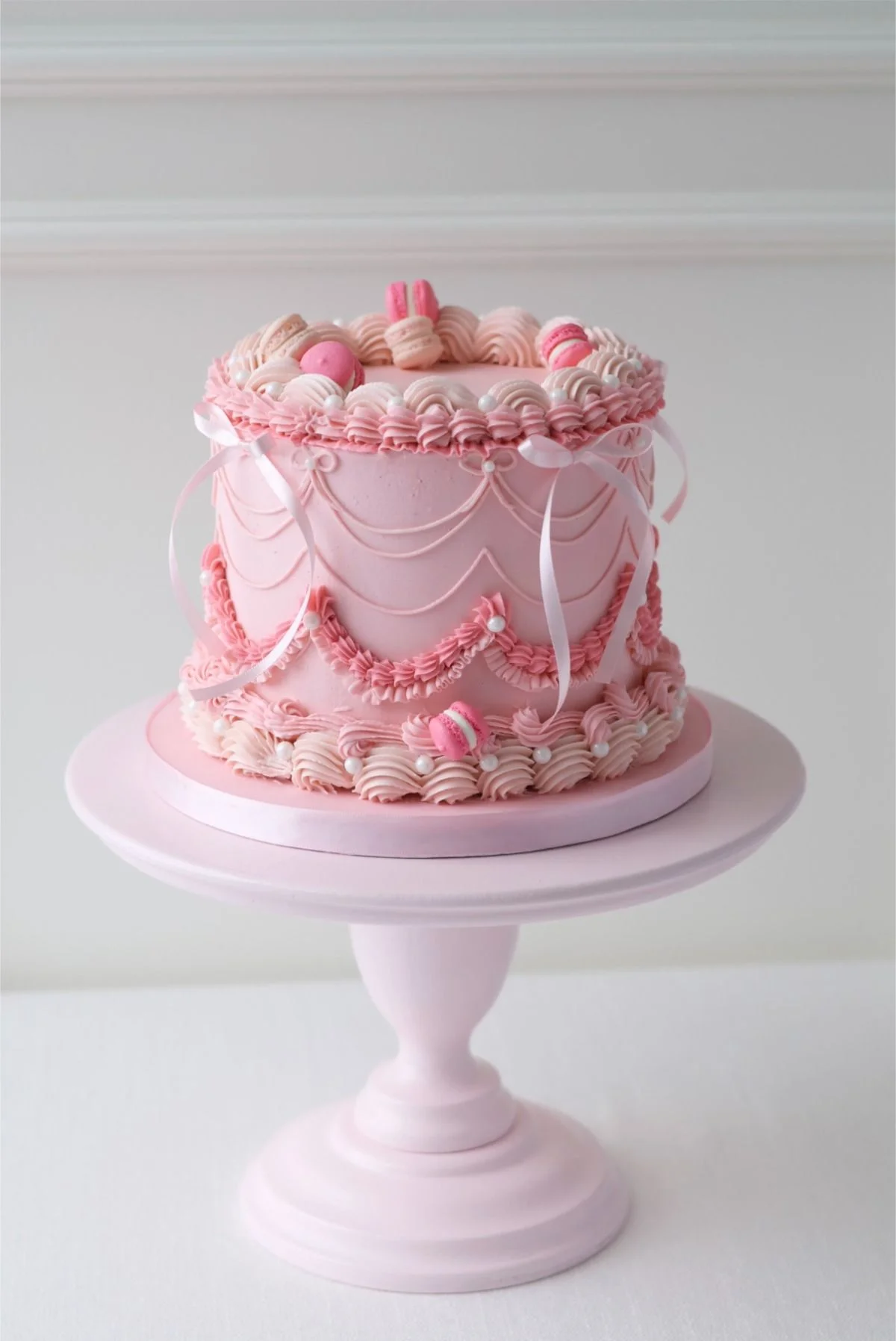 Elegant pink vintage-style cake with intricate ruffles, piped swags, white pearls, pink macarons, and delicate satin ribbons on a pink stand.