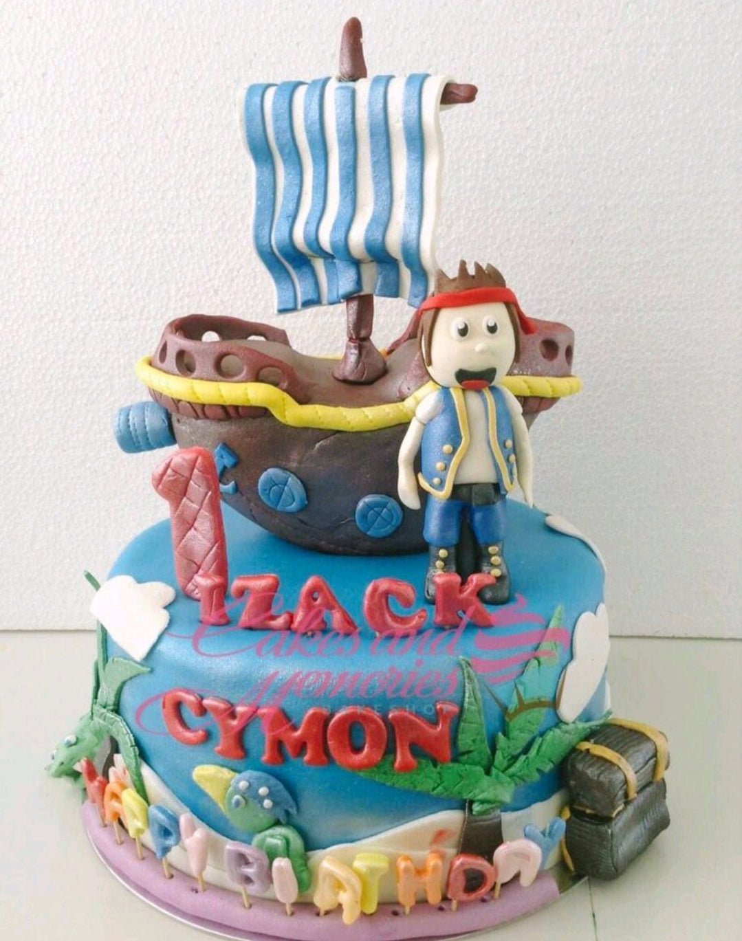 Pirate ship themed birthday cake with a fondant pirate figure, ship topper, and treasure chest accents on blue icing.