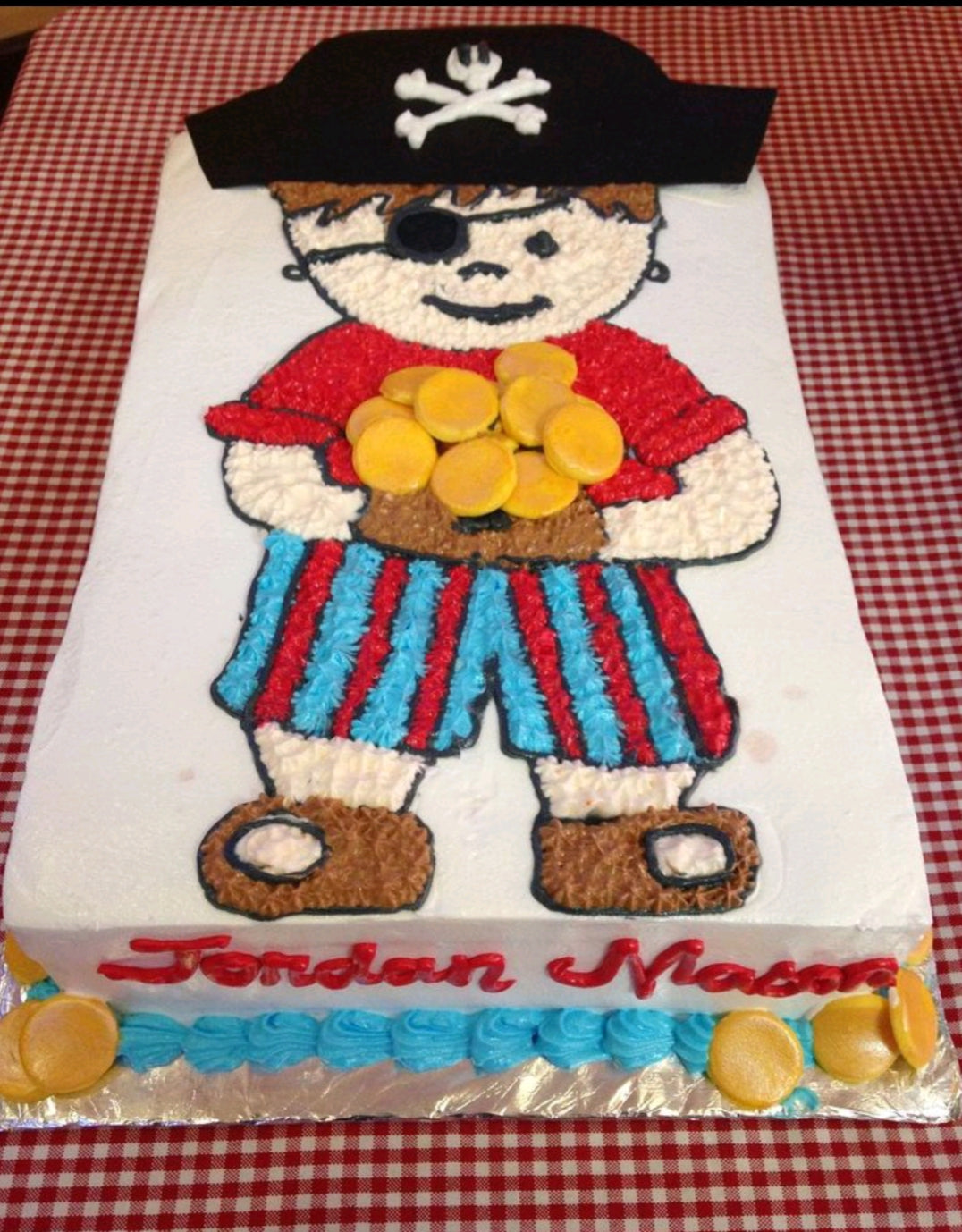 Rectangle pirate themed birthday cake with a large piped icing pirate character holding gold coins and red name message.