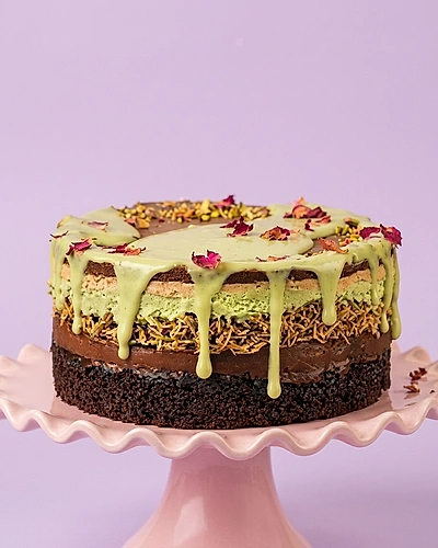 Pistachio Crunch cake with chocolate and pistachio layers, green pistachio drip, and dried rose petals on a pink stand.