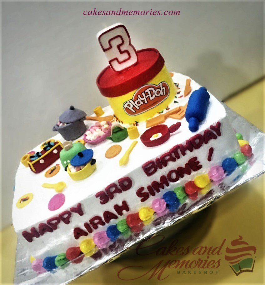 Rectangle Play-Doh themed birthday cake with colorful fondant kitchen tools and a large yellow Play-Doh tub topper.