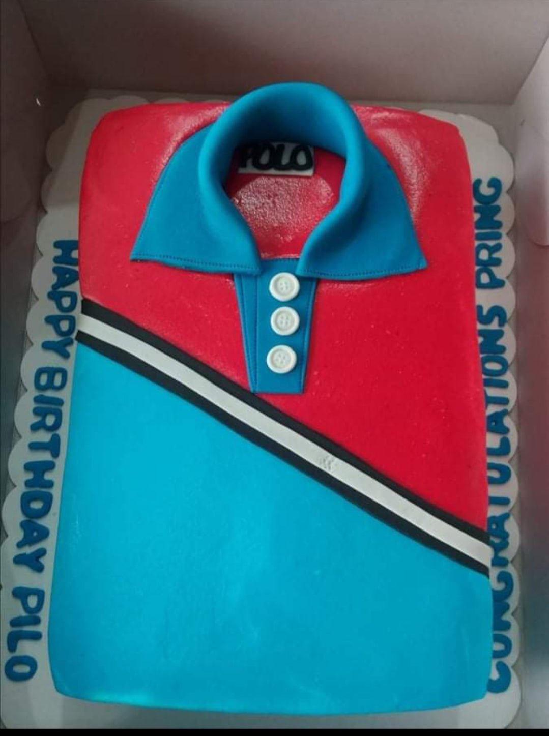 Red and blue polo shirt shaped fondant cake with white buttons and black and white stripes.