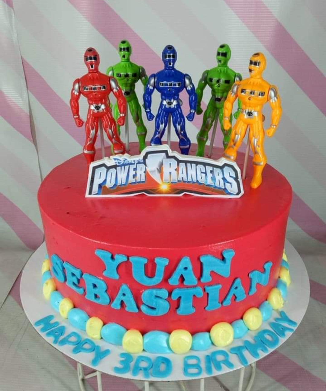 Red Power Rangers themed birthday cake with five action figures and a logo topper for Yuan Sebastian's 3rd birthday.