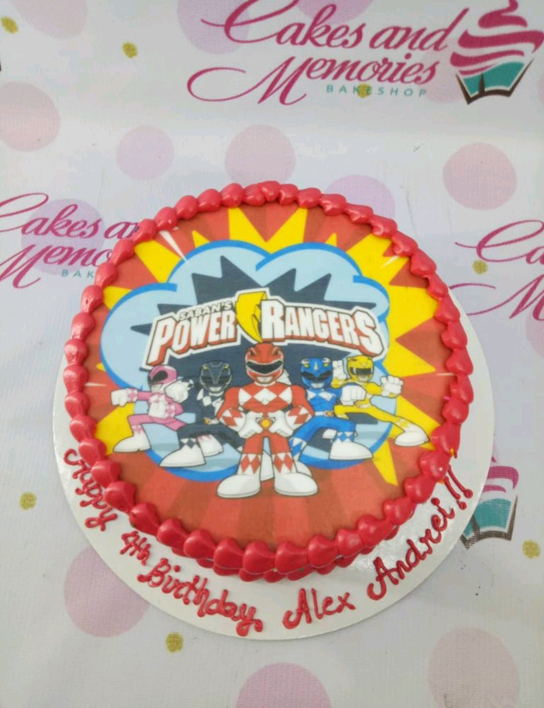 Round Power Rangers birthday cake with red icing heart borders and a large printed character topper on top.