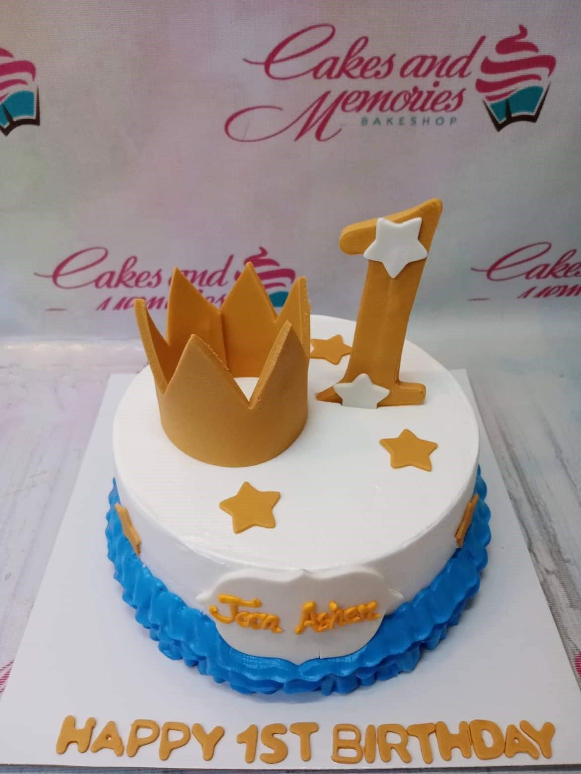 White 1-tier birthday cake with a large gold crown, a gold number one topper, and blue icing ruffles at the base.