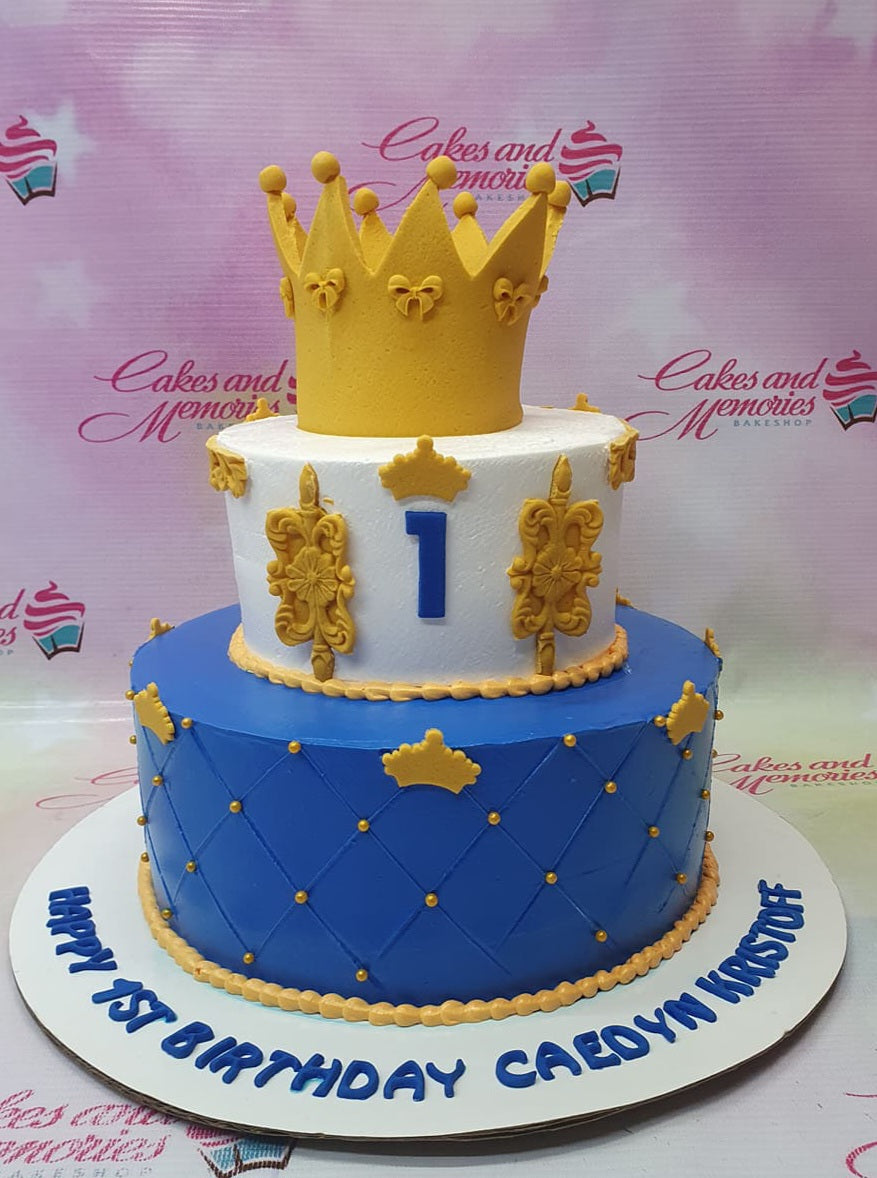 Royal blue and white 2-tier prince birthday cake with a large gold crown topper and quilted icing pattern.