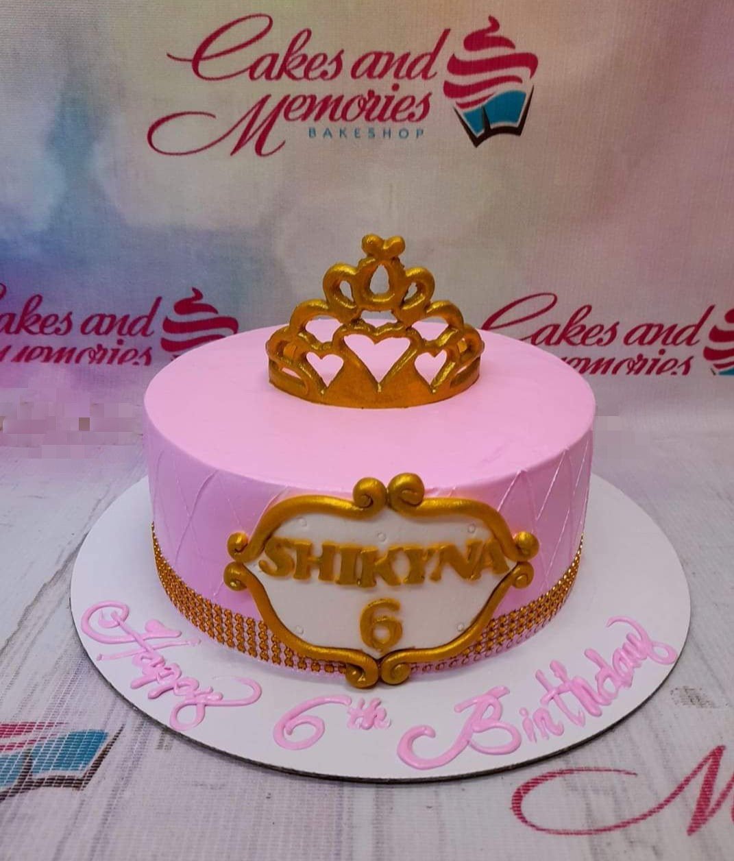 Pink princess birthday cake with a gold crown topper and a personalized name plaque on the side.
