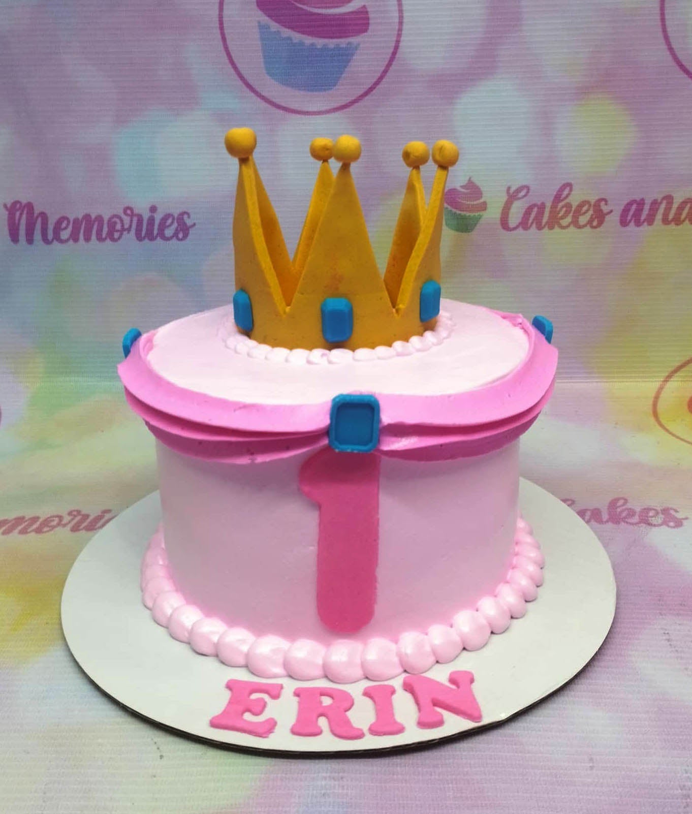 Pink princess themed cake with a large gold crown topper, pink icing drapes, and a large number one on the side.