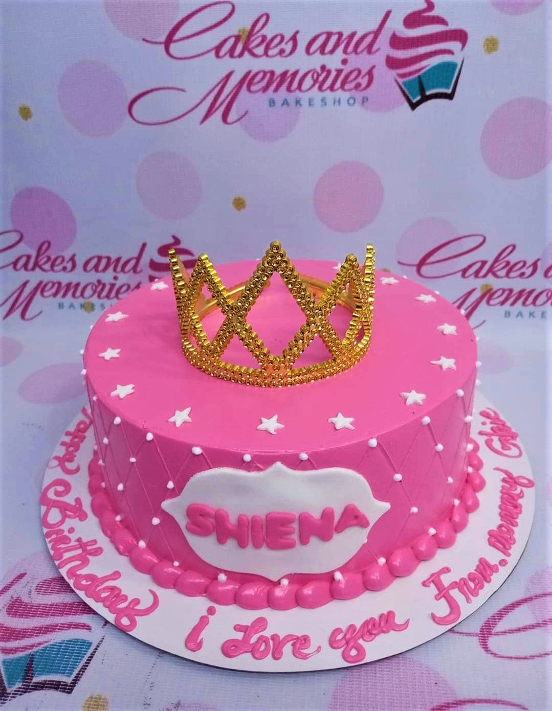 Pink princess birthday cake with a gold crown topper, white stars, and quilted icing pattern.