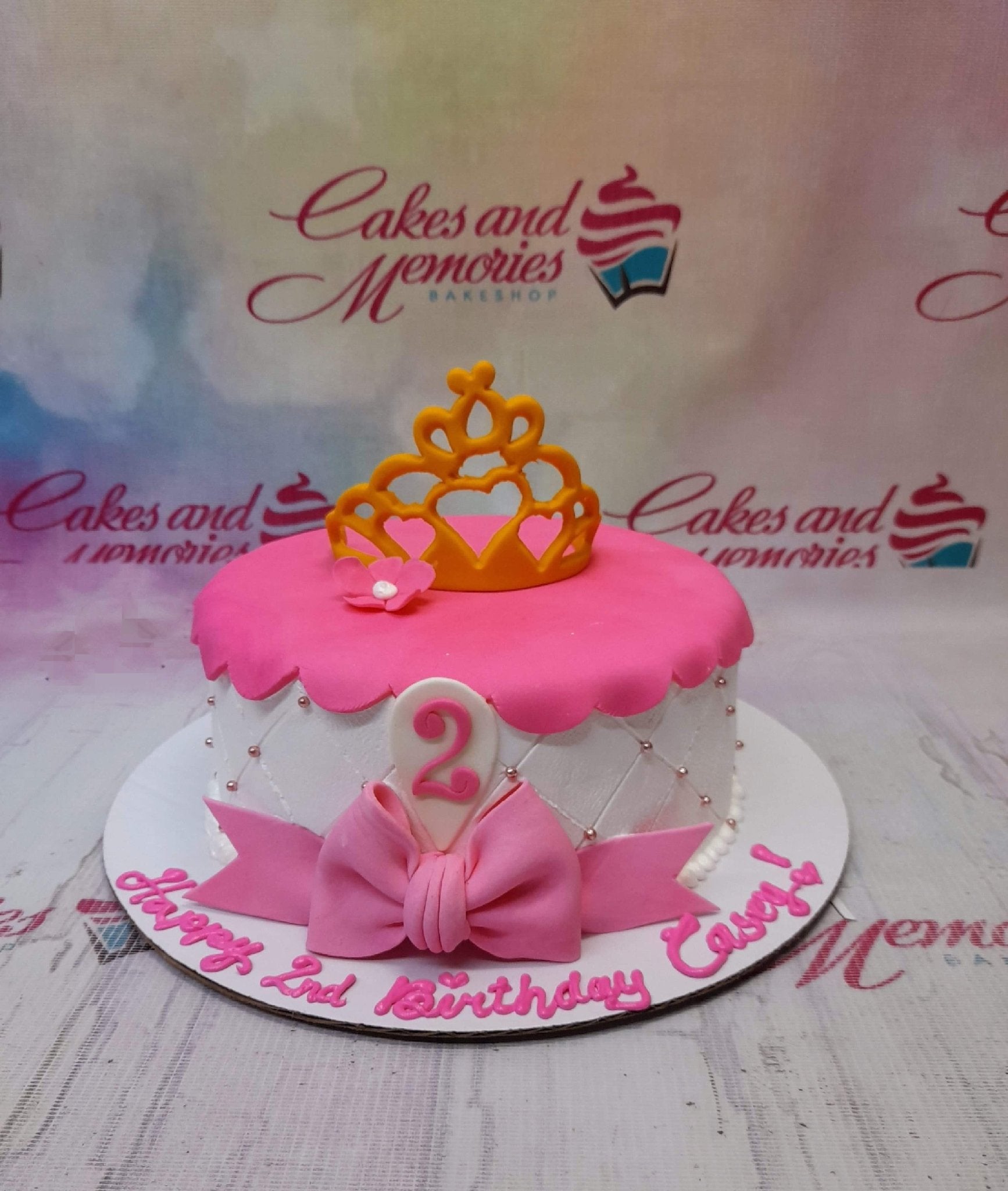 Pink and white quilted fondant cake with a large pink bow, a gold crown topper, and a pink number 2 on the side.
