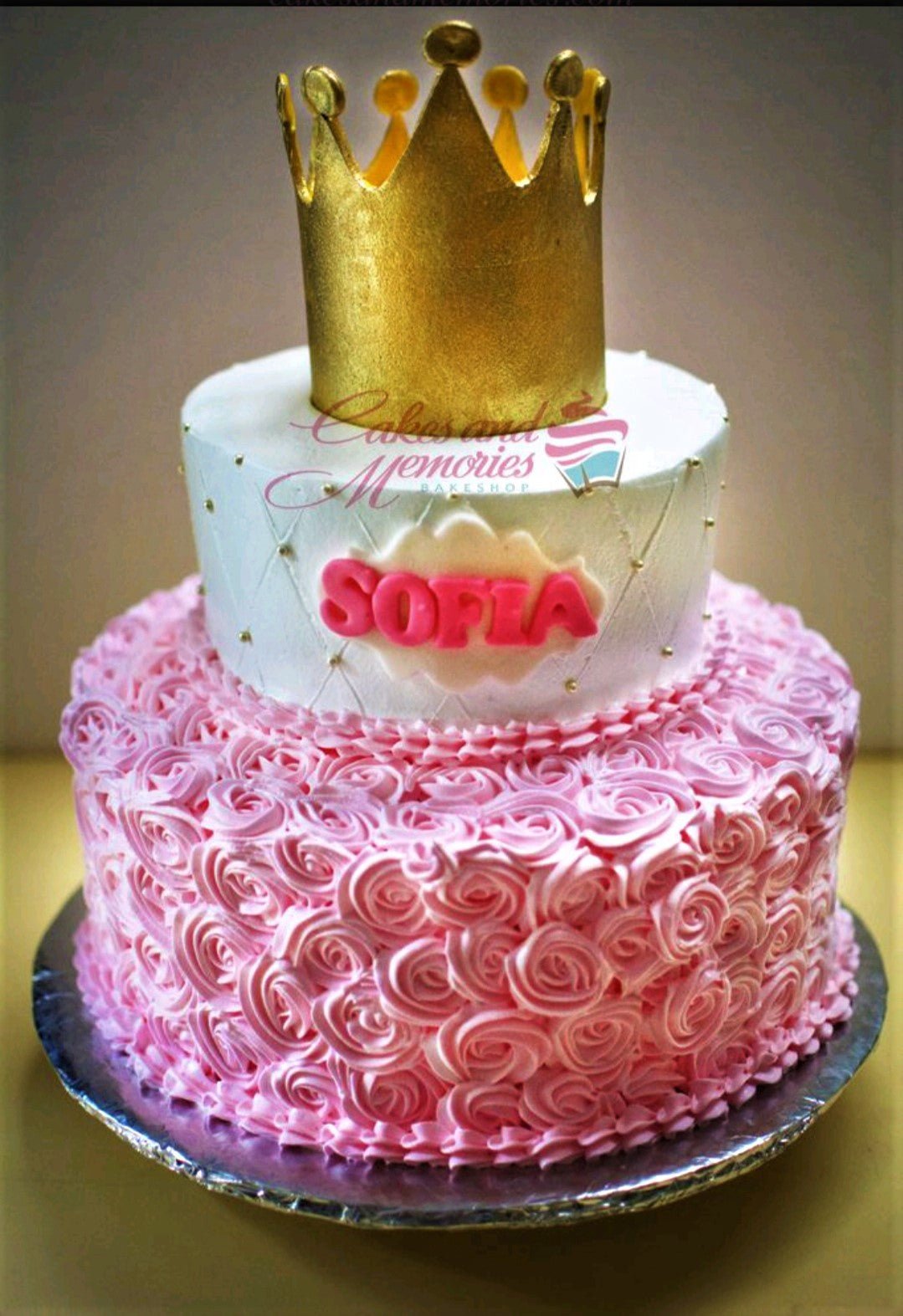 Two-tier pink and white princess cake with a large gold crown topper and pink icing rosettes on the bottom tier.