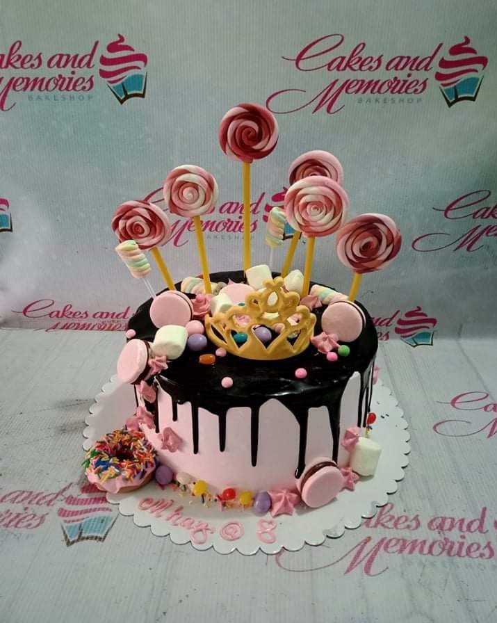 Pink 1-tier birthday cake with chocolate drip, gold crown toy, lollipops, marshmallows, and macarons.