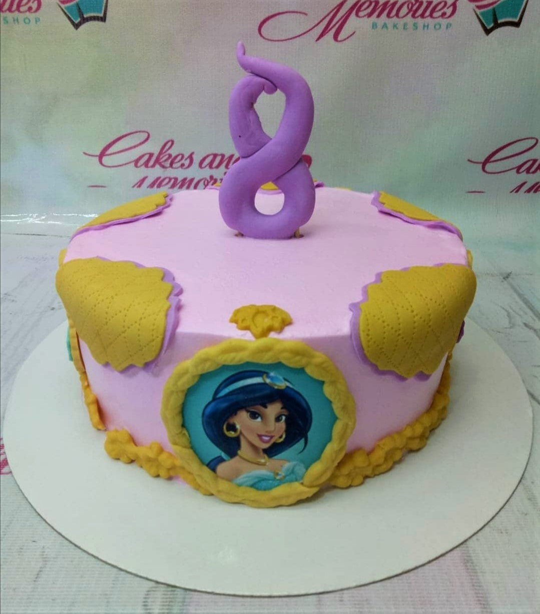 Pink Princess Jasmine themed birthday cake with gold quilted patterns and a purple number 8 topper.