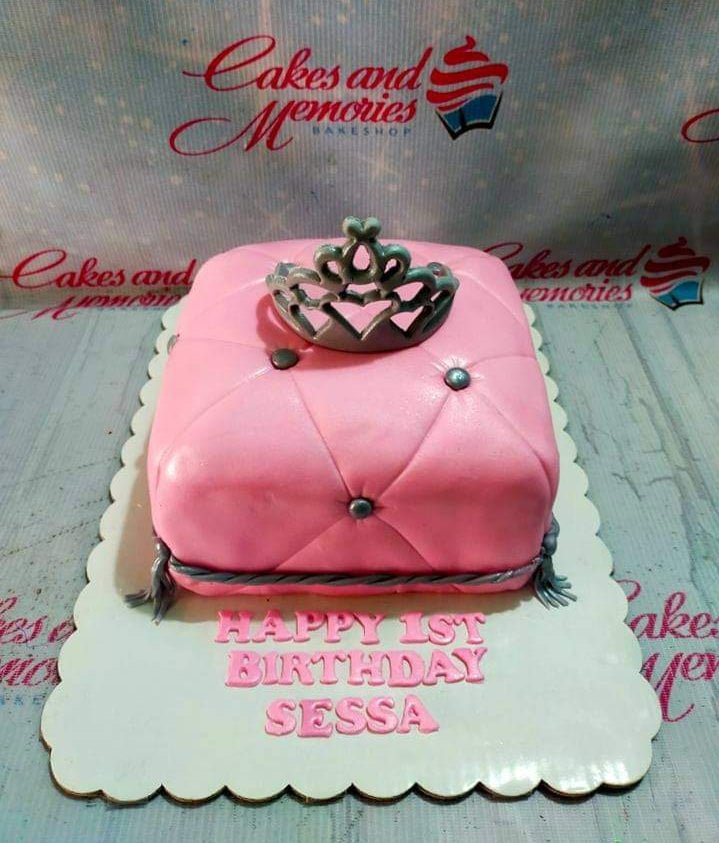Pink quilted pillow cake with a silver crown topper and silver tassels for a 1st birthday celebration.