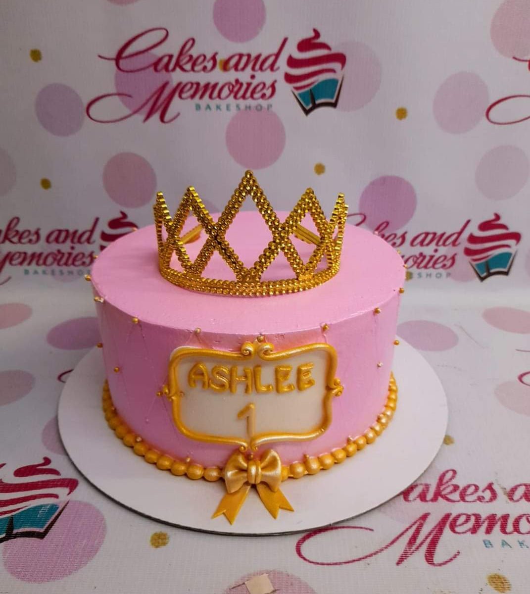 Pink princess birthday cake with a large gold crown topper, quilted icing pattern, and a gold name plaque for Ashlee.