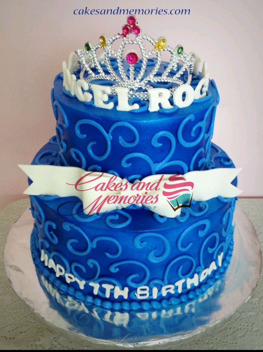 Two-tier royal blue fondant cake with intricate light blue icing swirls, a white fondant bow, and a silver rhinestone tiara on top.