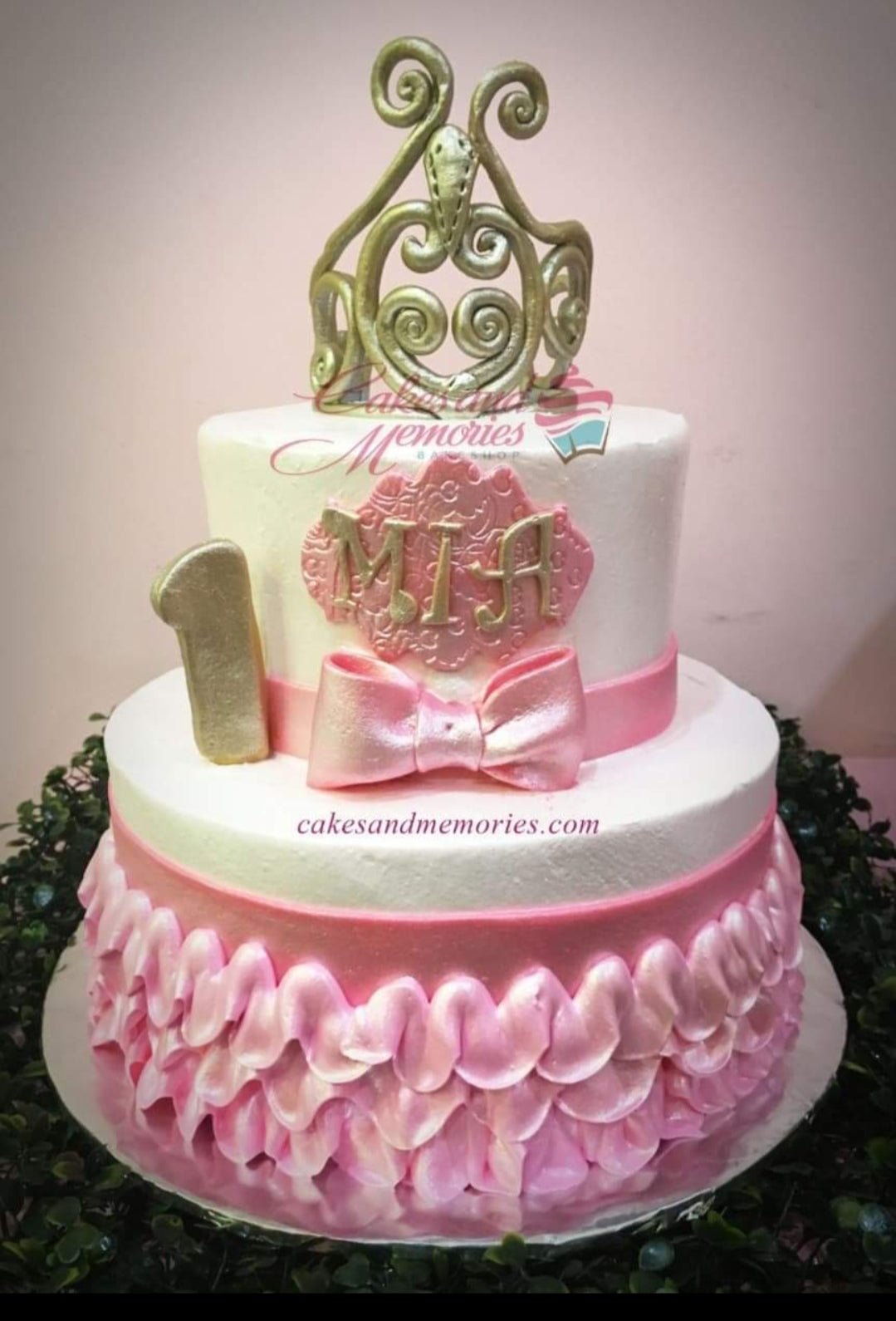 Two-tier pink and white birthday cake with a large gold crown topper, pink bow, and ruffled icing on the bottom tier.