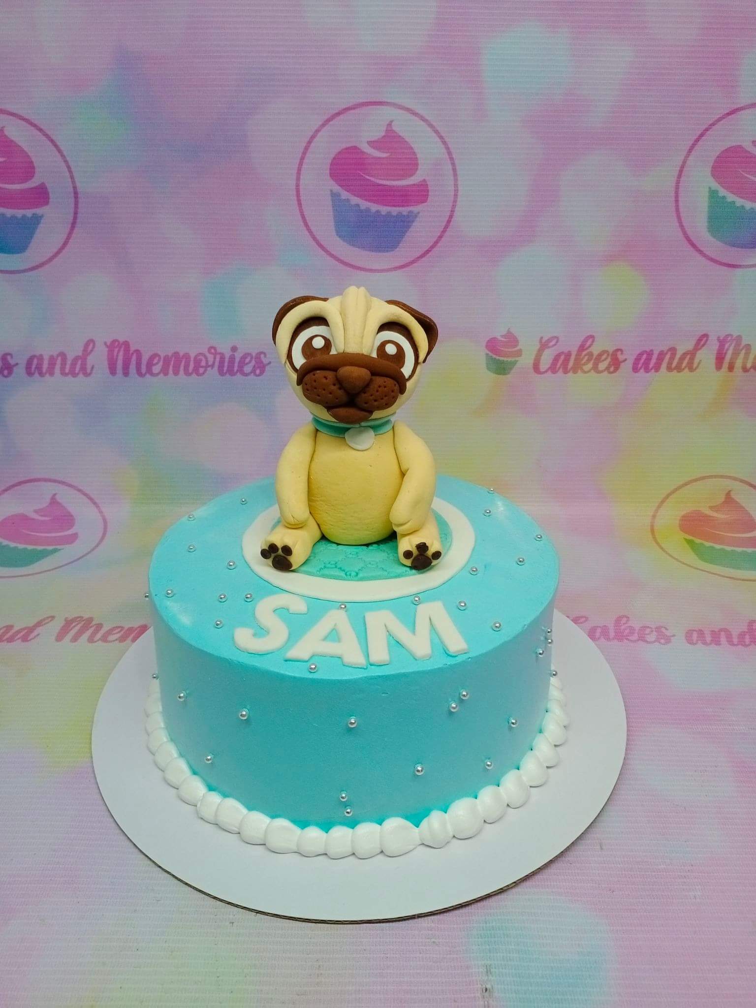 This charming 1-tier pug birthday cake is perfect for any dog lover's celebration. The design features a smooth light blue soft icing base decorated with elegant silver dragees and a white piped border. A detailed 3D fondant pug figure sits atop the cake as the central hero element. The name SAM is prominently displayed on the side in white gumpaste letters. This adorable design is ideal for making a pet enthusiast's special day truly memorable. Order your custom celebration cakes through Genie.ph for delivery in Cebu City, Mandaue, and Lapu-lapu City.