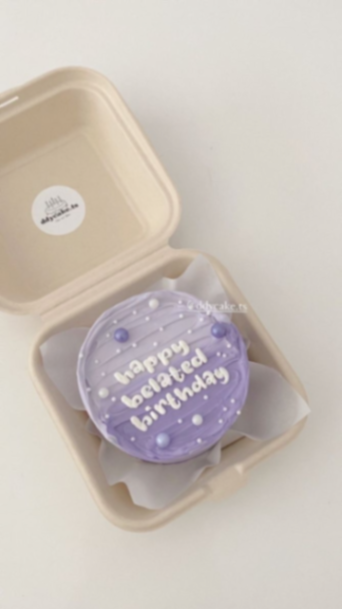 Purple bento cake with lavender gradient icing, white piped message, and purple and white sugar pearls in a clamshell box.