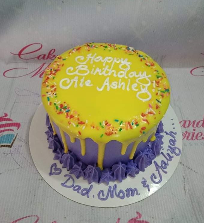 Purple birthday cake with yellow drip icing, colorful sprinkles, and white piped message for Ate Ashley.