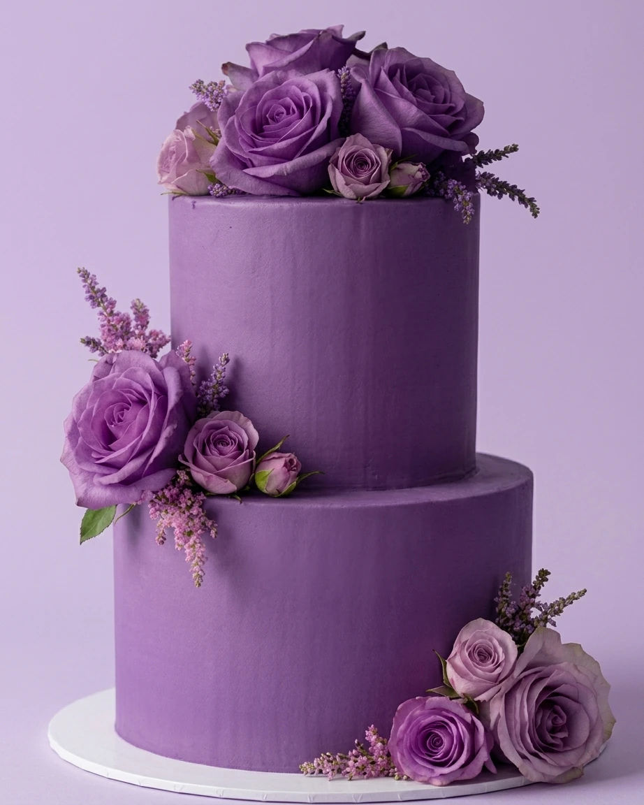Elegant two-tier purple cake decorated with clusters of fresh purple roses and lavender sprigs on a white base.