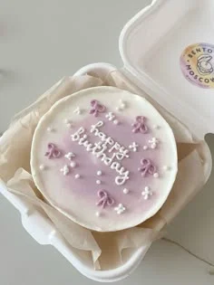 Purple and white bento cake with piped icing bows and white sprinkles for a birthday celebration.