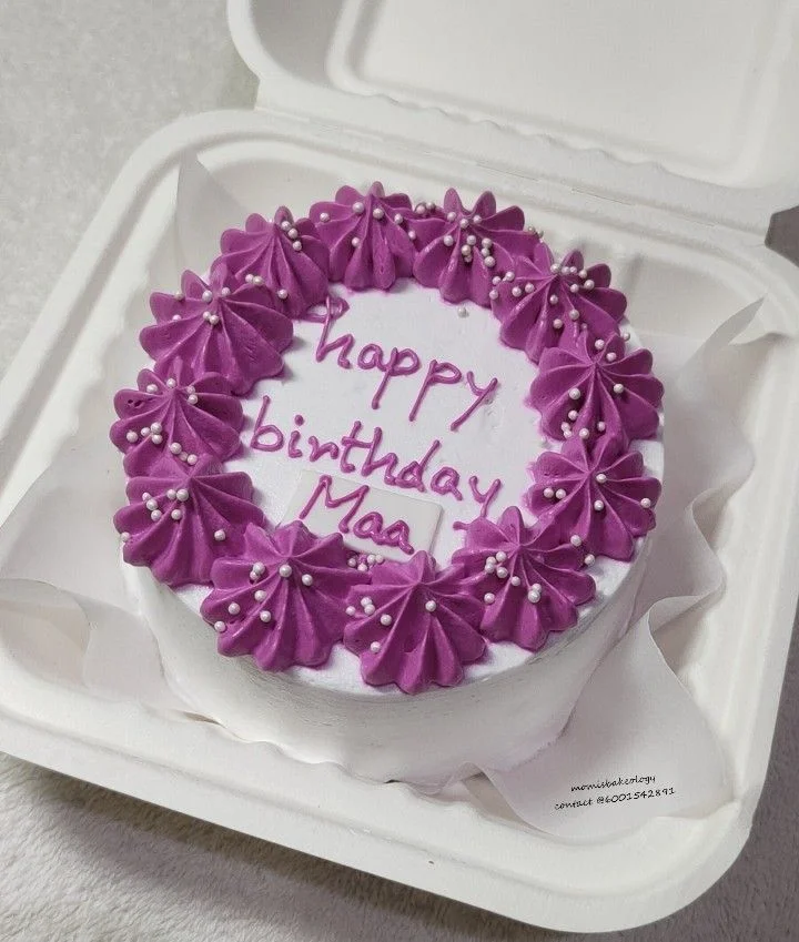 White bento cake with purple icing rosettes and white pearl sprinkles featuring a Happy Birthday Maa message.