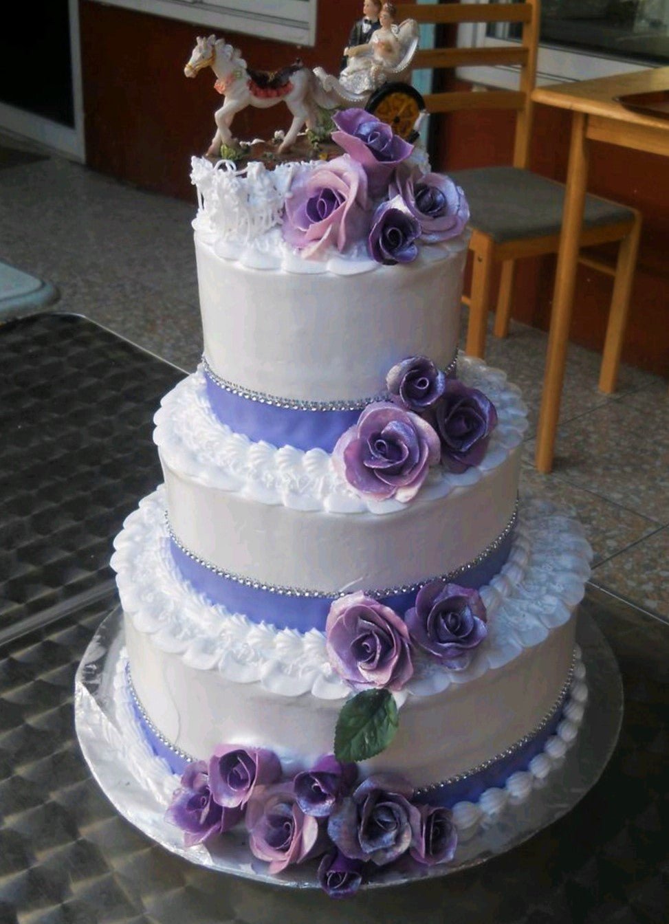 Elegant 3-tier white wedding cake with purple icing roses, silver bead borders, and a horse-drawn carriage topper with a bride and groom.