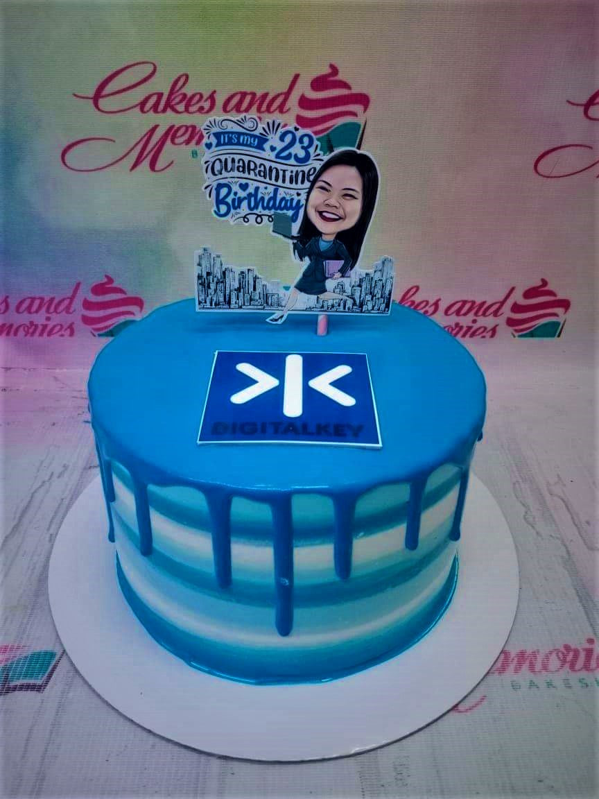 Blue and white striped birthday cake with a blue drip and a custom caricature topper for a 23rd quarantine birthday.