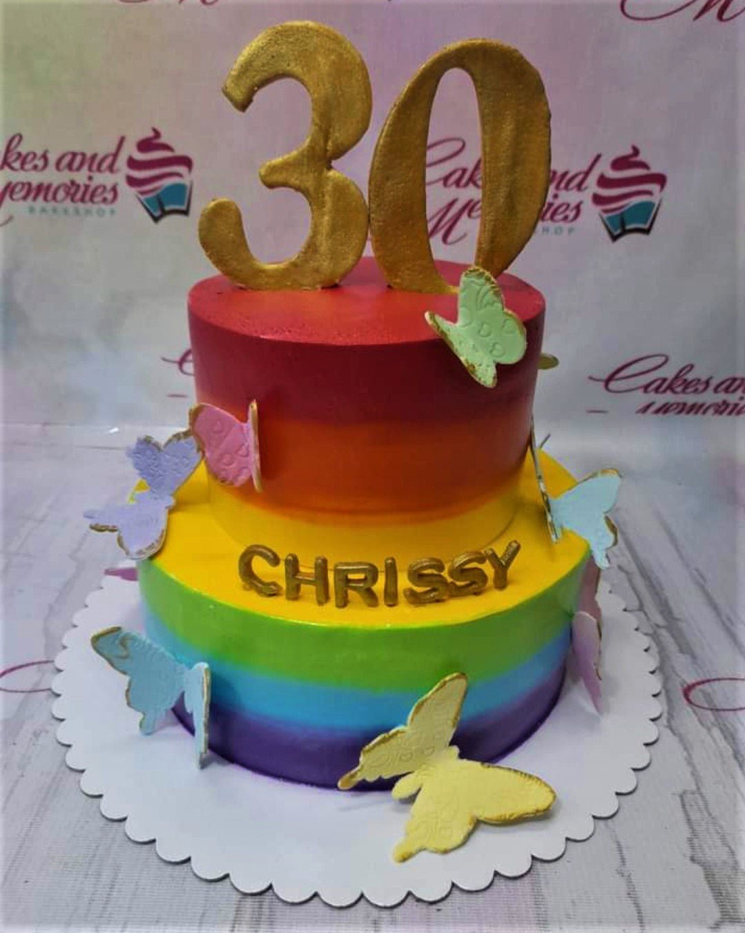 A vibrant two-tier rainbow gradient cake with gold number 30 topper, colorful butterflies, and the name Chrissy in gold letters.
