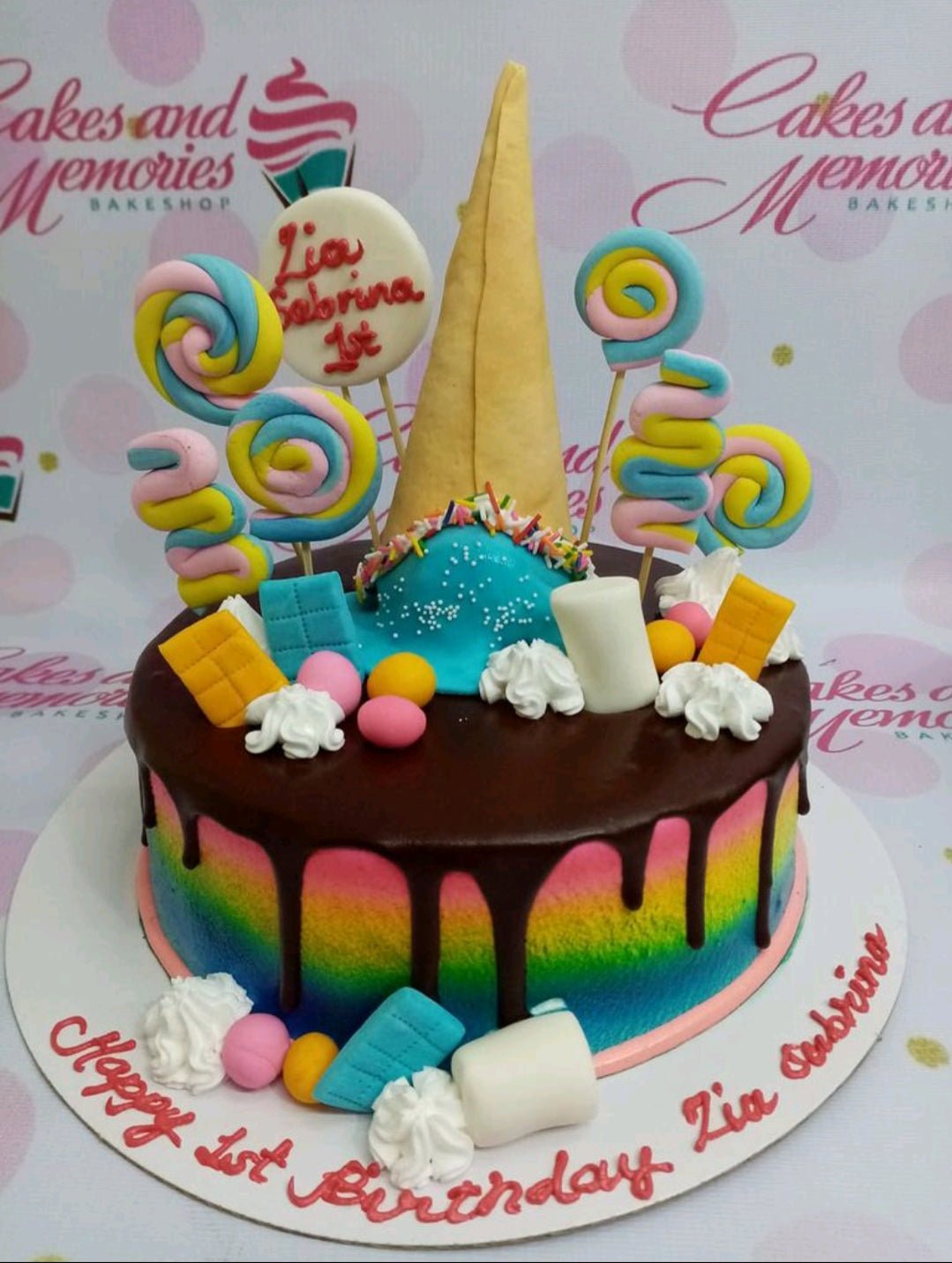 Rainbow drip cake with chocolate ganache, colorful fondant lollipops, marshmallows, and chocolate bar decorations for a 1st birthday.