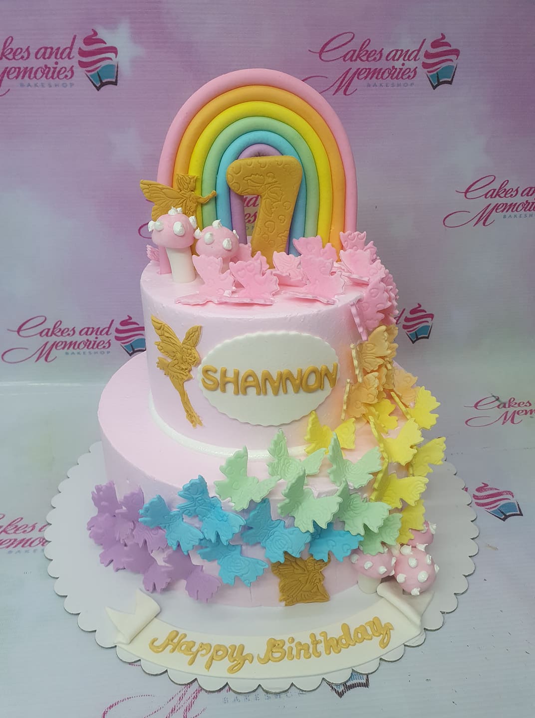 A two-tier pink birthday cake for Shannon featuring a large rainbow, fondant butterflies in pastel colors, and gold fairy silhouettes.