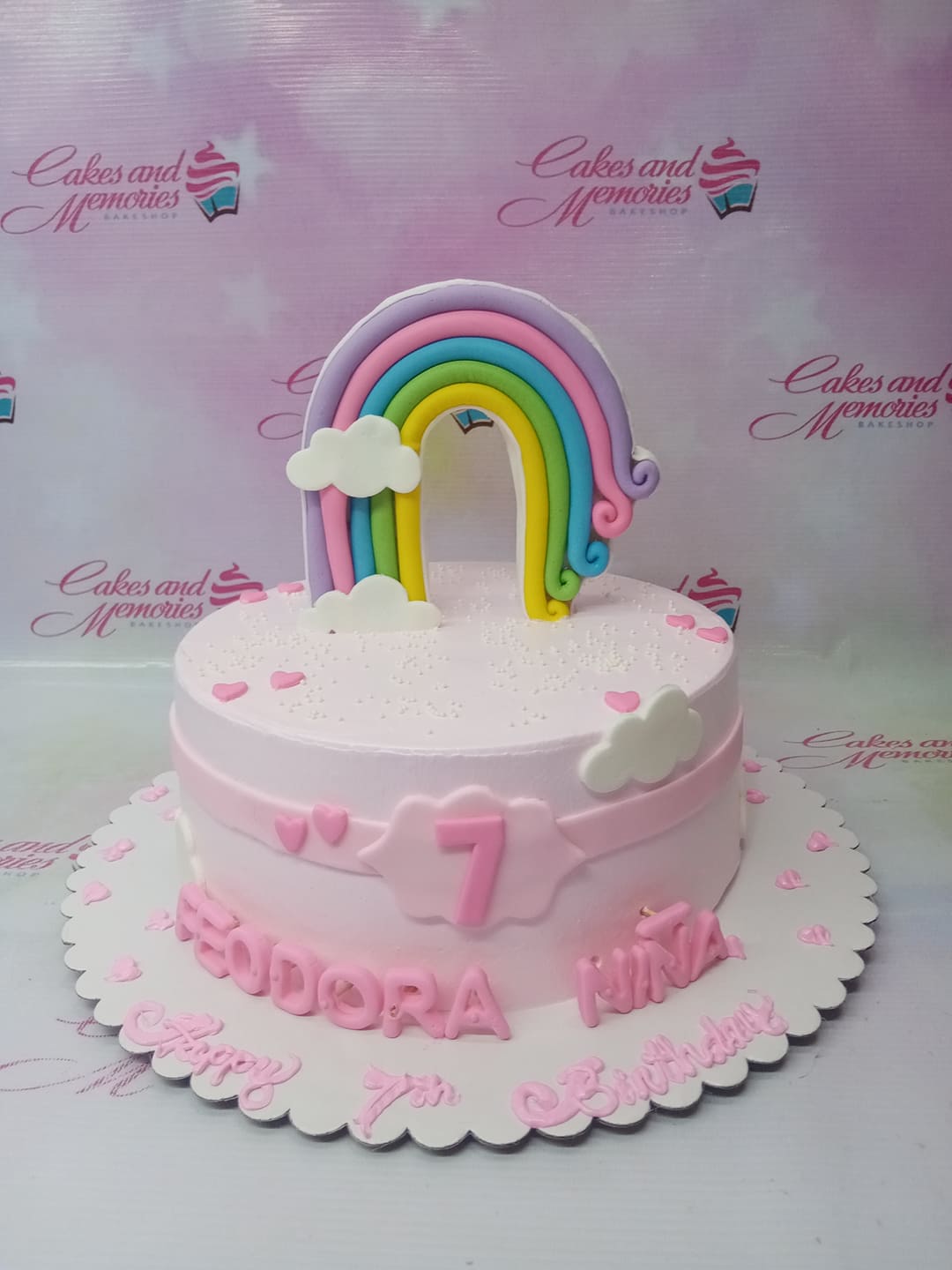 Pink rainbow birthday cake with fondant clouds, hearts, and a colorful rainbow topper for a 7th birthday celebration.
