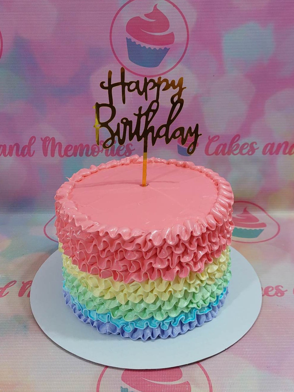 Rainbow ruffle cake with pink, yellow, green, blue, and purple icing layers and a gold Happy Birthday topper.