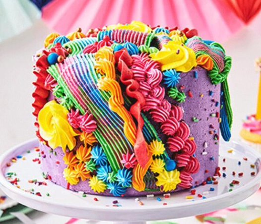 A vibrant purple single-tier cake covered in a dense explosion of multi-colored icing ruffles, swirls, and rosettes in rainbow hues.