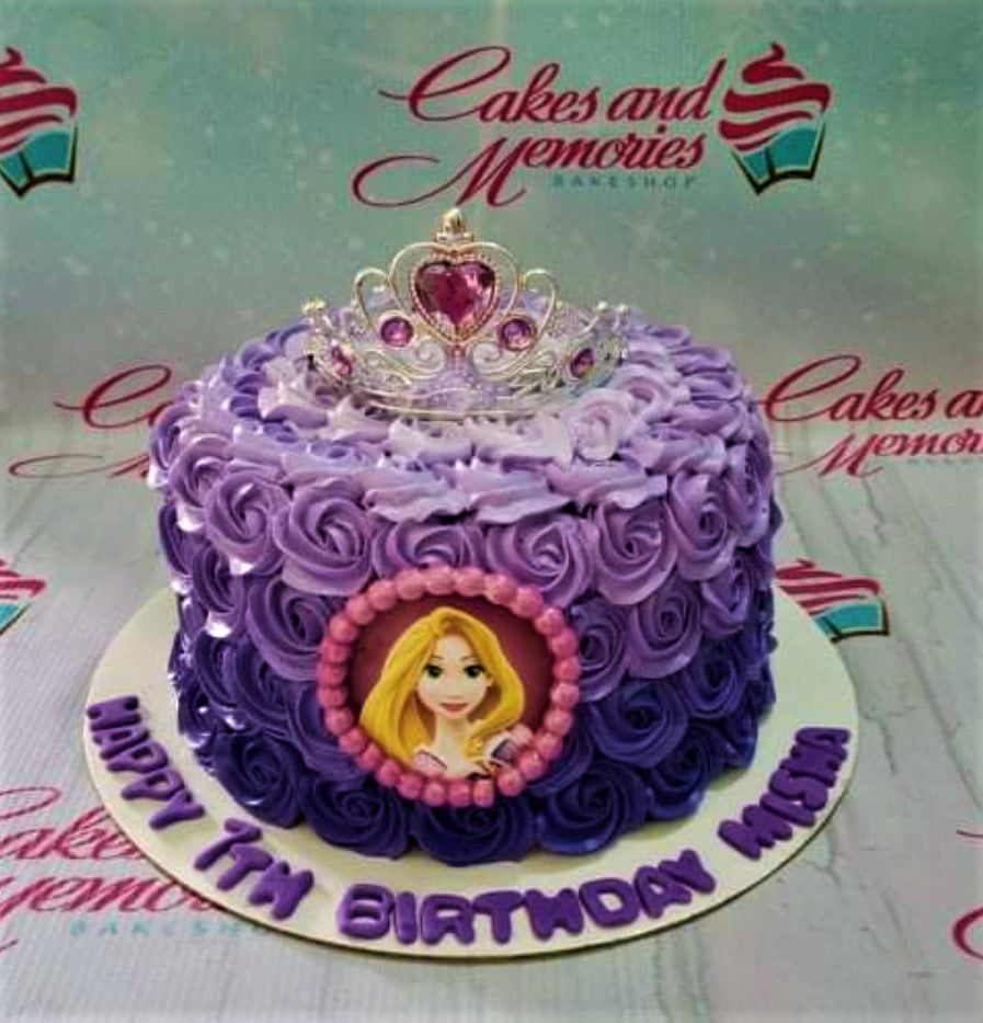 Purple ombre rosette cake with a Rapunzel printout and a silver rhinestone tiara topper.