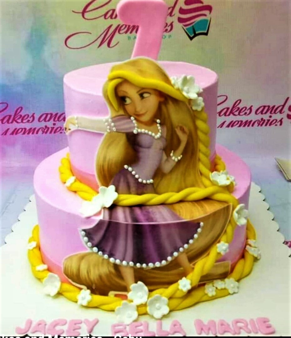 Two-tier pink Rapunzel themed birthday cake with long yellow fondant hair wrapping around both tiers and white flower accents.