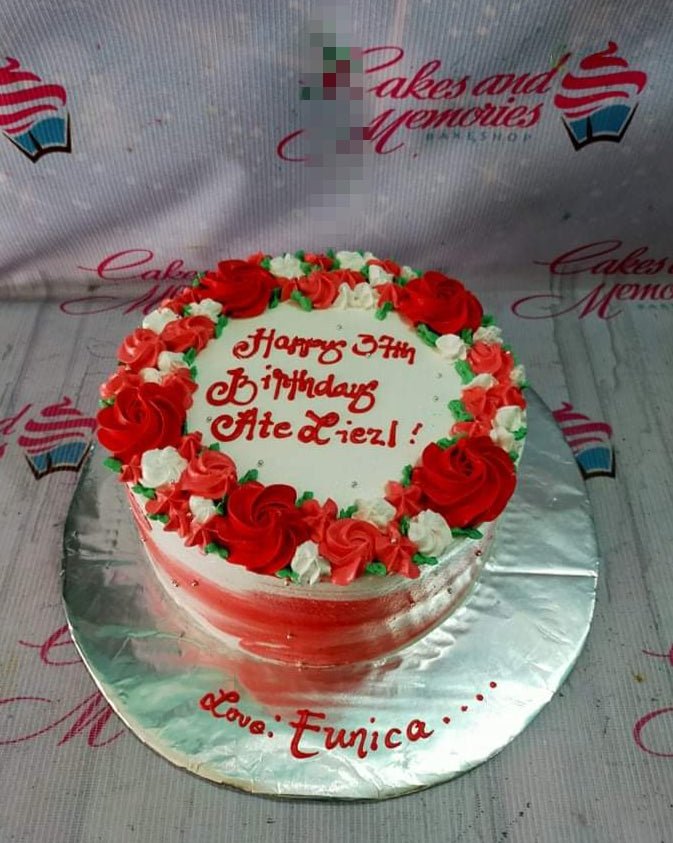 White round cake with red and white icing rosettes and a birthday message for Ate Liezl