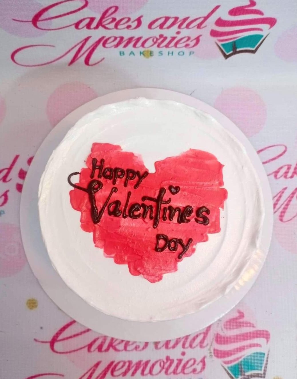 White bento cake with a red palette knife heart and chocolate piped Happy Valentines Day message