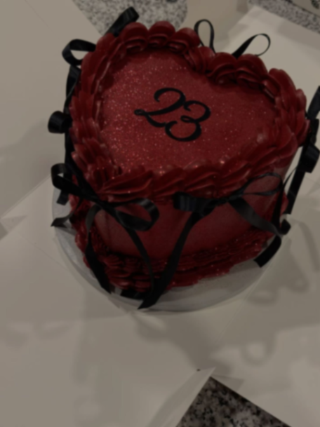 Heart-shaped dark red vintage cake with black satin ribbons and a black number 23 topper.