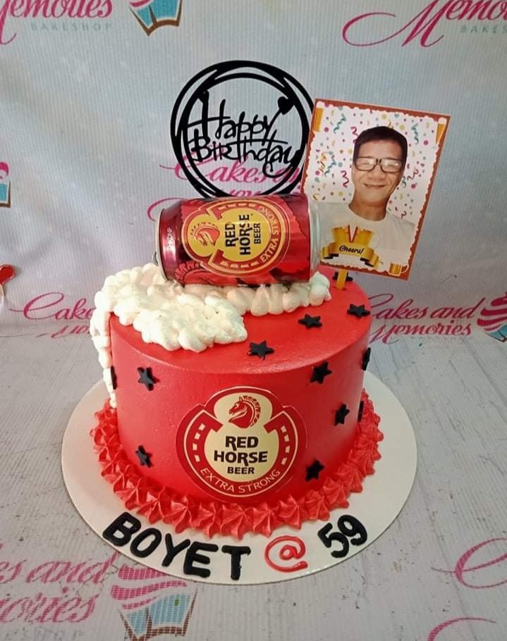 Red Horse Beer themed birthday cake with a red base, black stars, and a photo topper for a 59th birthday.