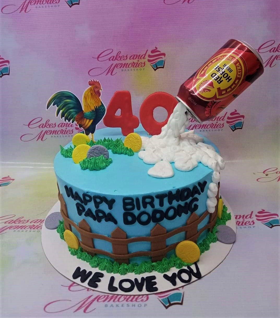 Light blue birthday cake for Papa Dodong with a Red Horse beer can topper, a rooster printout, and fondant fence and grass details.