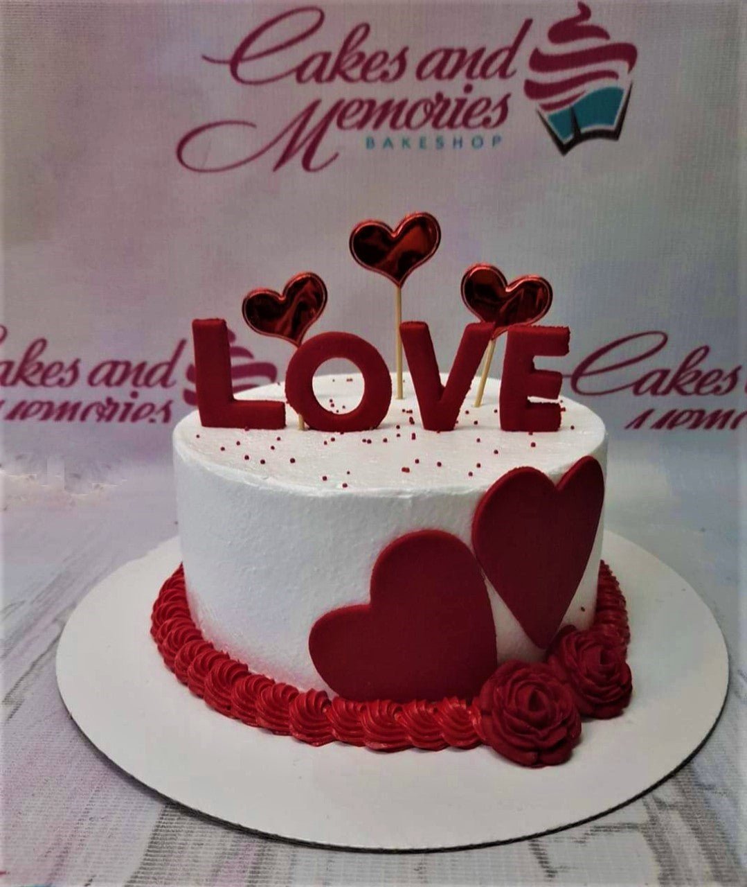 White soft-icing cake with red fondant hearts, red roses, and a 3D red LOVE topper with metallic red heart accents.