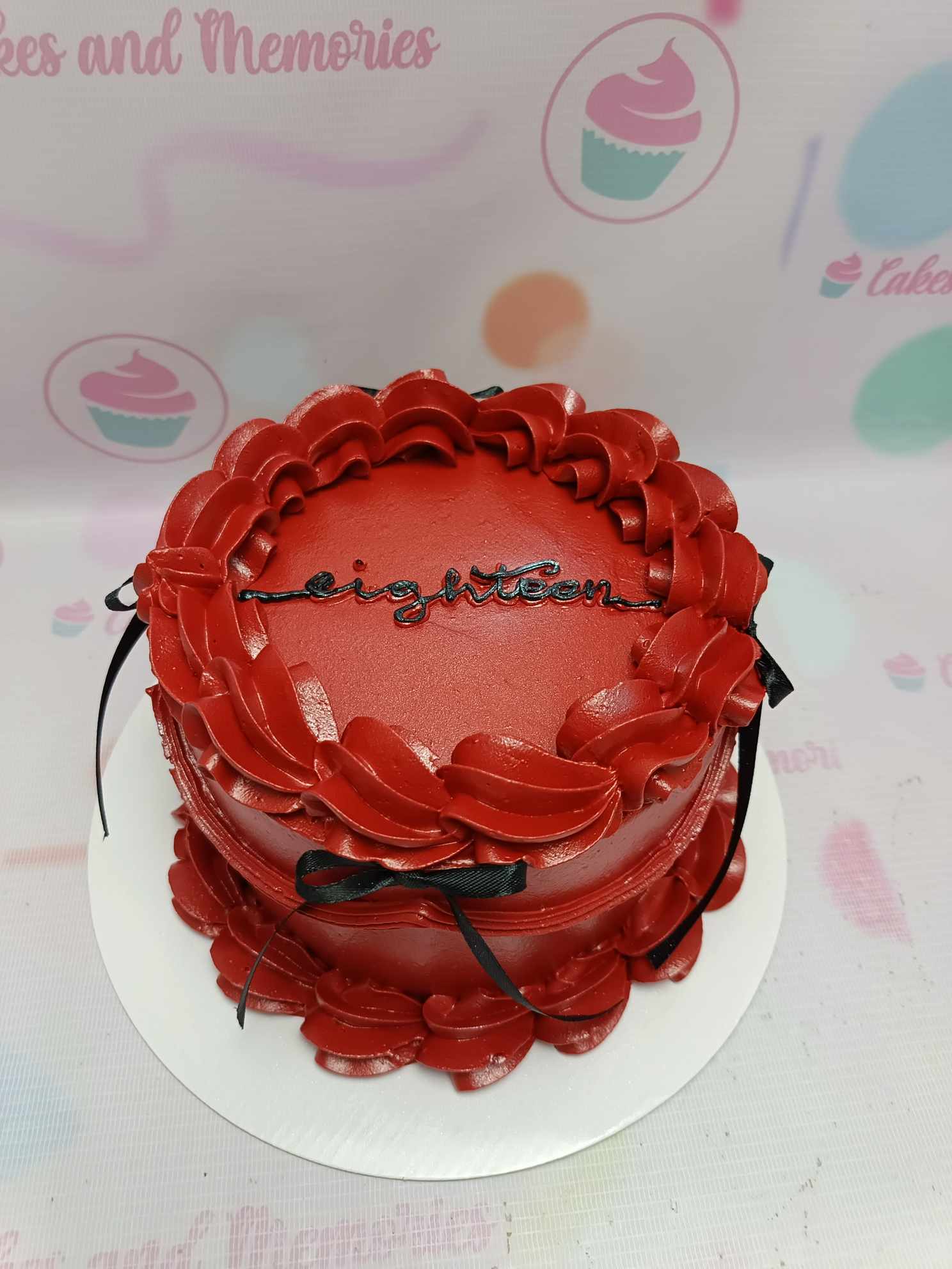 Deep red minimalist cake with ruffled icing borders, black ribbons, and a black 'eighteen' message on top.